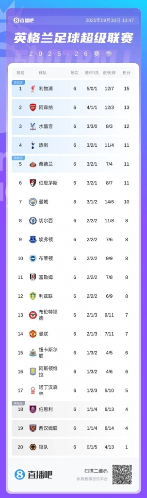 09月30日讯 英超第6轮全部战罢,不败队伍仅剩水晶宫1支,这一轮他们正好终结了此前5轮全胜的利物浦。