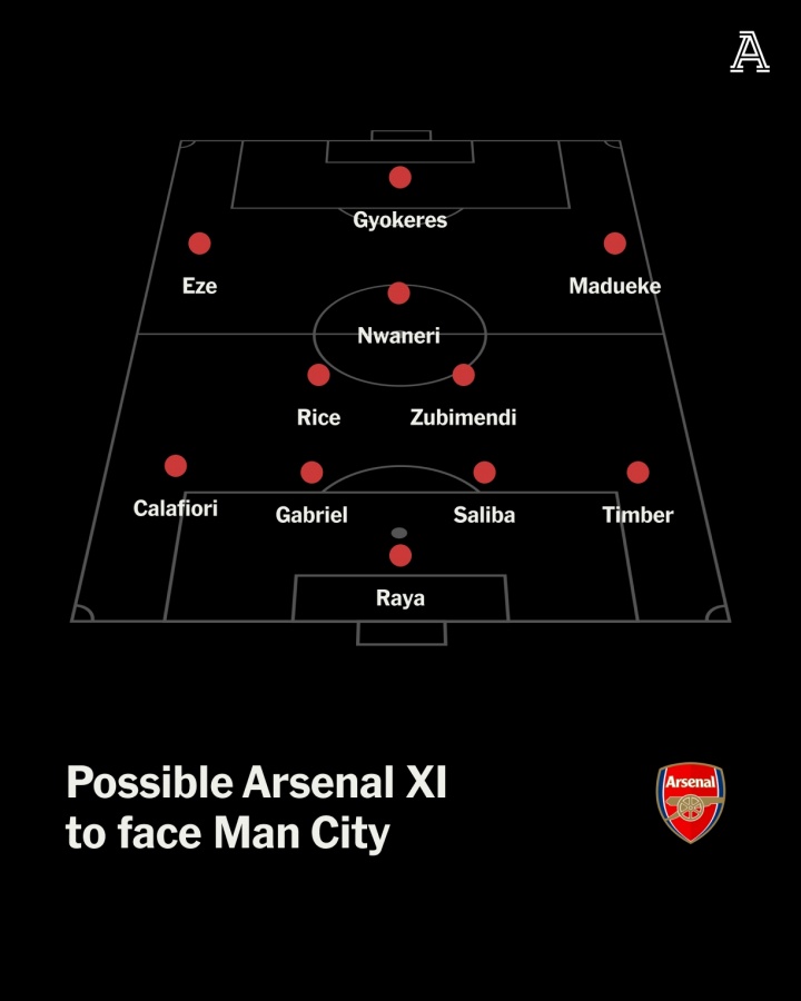 TA预测阿森纳对阵曼城首发11人: